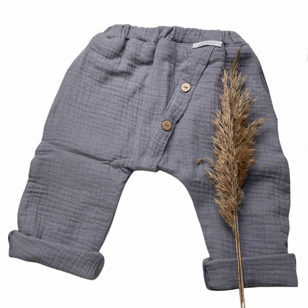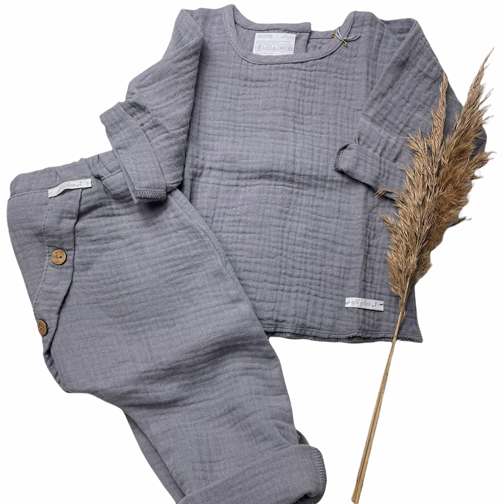 Conjunto de bebé de muselina doble de algodón orgánico, pantalón y camisa. Este conjunto está confeccionado con tejido de muselina doble de algodón 100% orgánico.