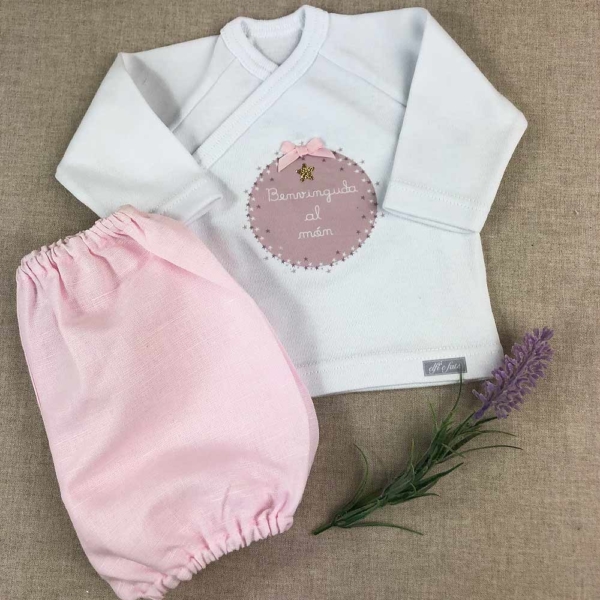 La colección Bienvenidos es clásica y muy dulce, lo puedes elegir con el texto en Catalán, o Castellano. Los colores disponibles son Rosa palo, Rosa, Azul, Gris, y beige, el bloomer viene a juego con el color del diseño.