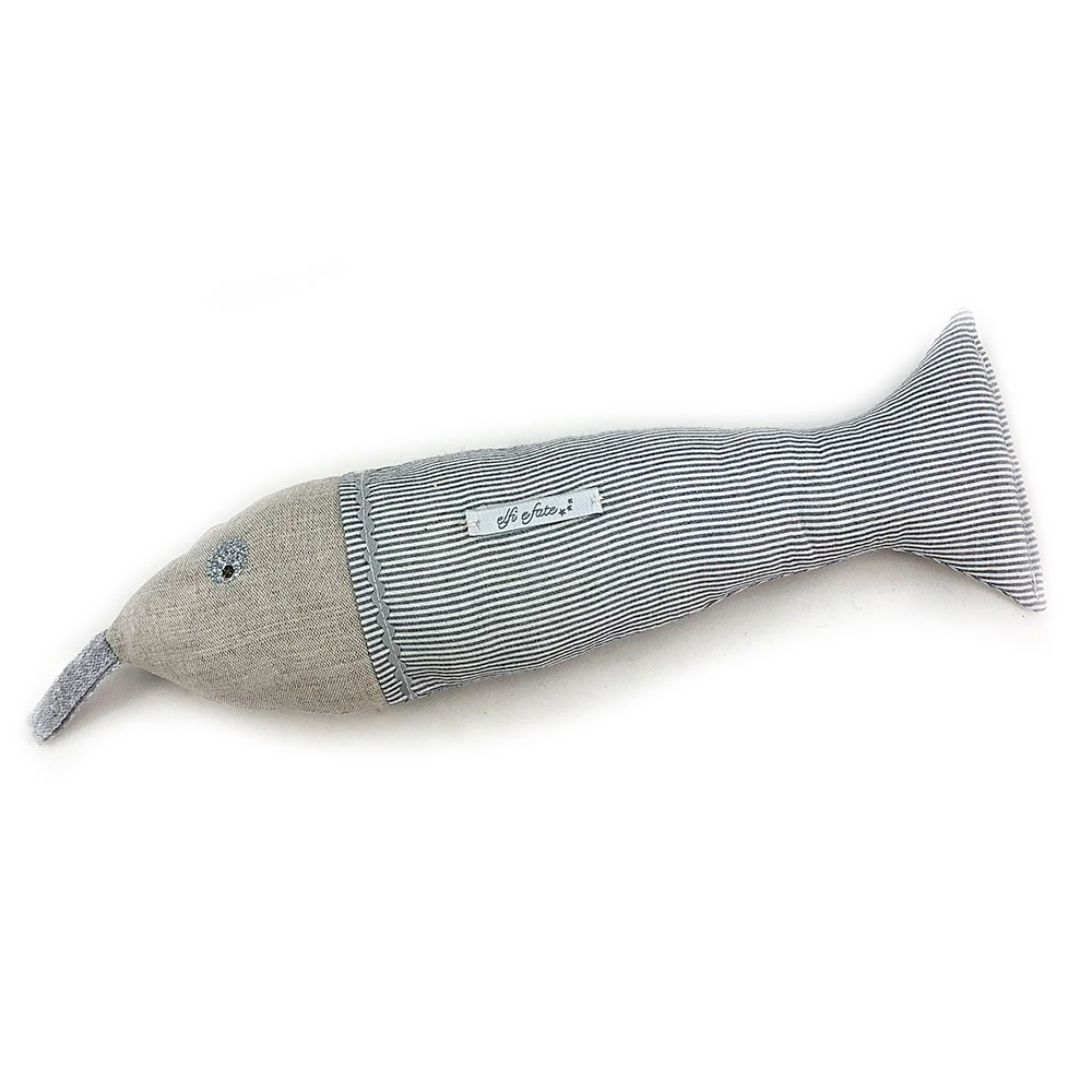 Juguete sonajero de tela para bebé sardina. Muy suave y muy blando, realizado con tejido de algodón. Es ideal para que acompañe a tu bebé desde el nacimiento para decorar su cuna, su dormitorio y sobre todo para hacerles sacar una sonrisa. No posee ninguna pieza que pueda soltarse, por este motivo es muy seguro. Su sonido es un cascabel de seguridad que está dentro del pez